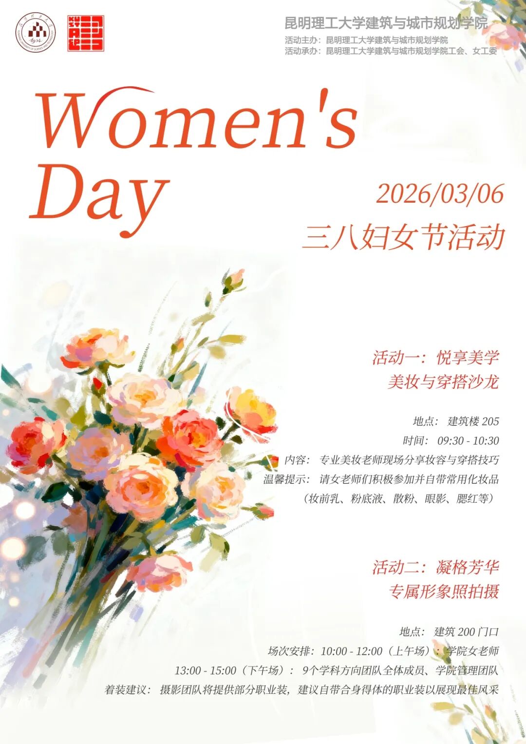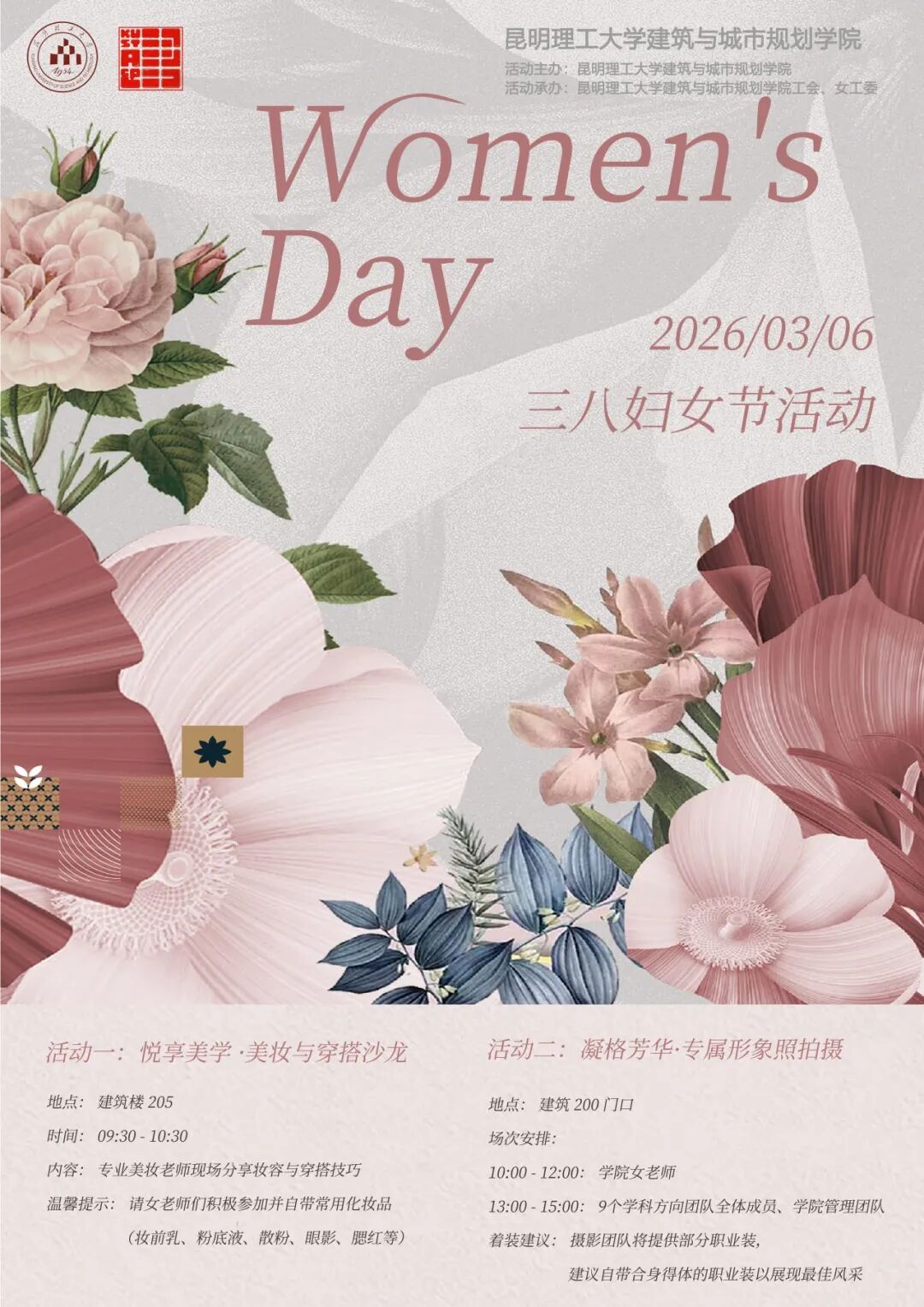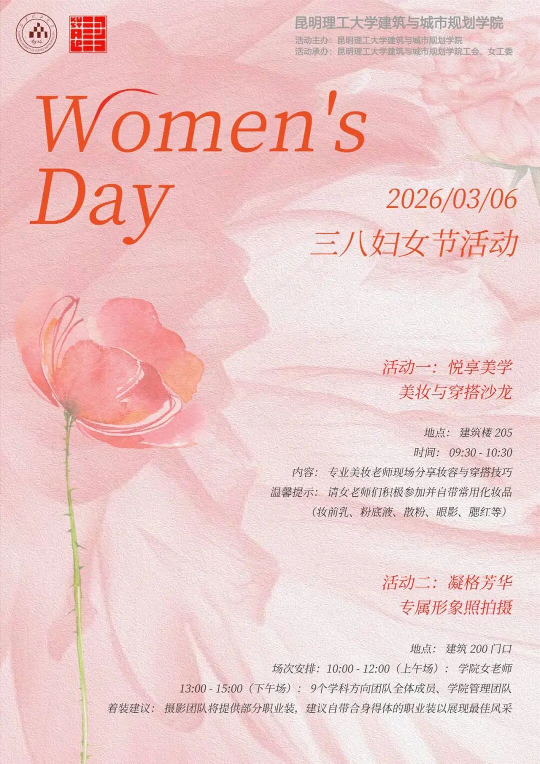 2026年3月,春风送暖,繁花初绽,“三八”国际妇女节如约而至。为致敬学院每一位在教学科研一线绽放光彩的女教师,建筑与城市规划学院于3月6日精心策划了“悦享美学 + 凝格芳华”系列节日活动,让女教师们在忙碌之余邂逅美好,定格自信风采,更让学院学科方向团队的凝聚力在温馨氛围中持续升温!